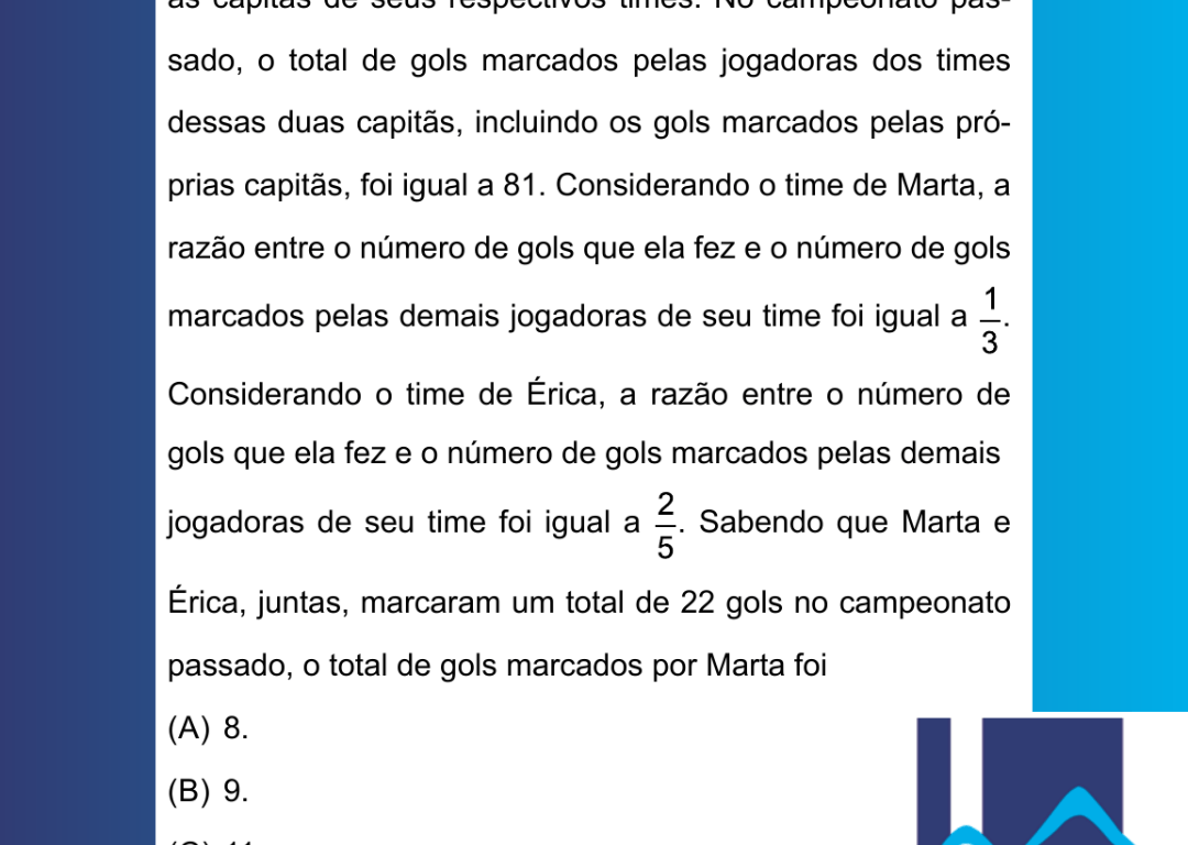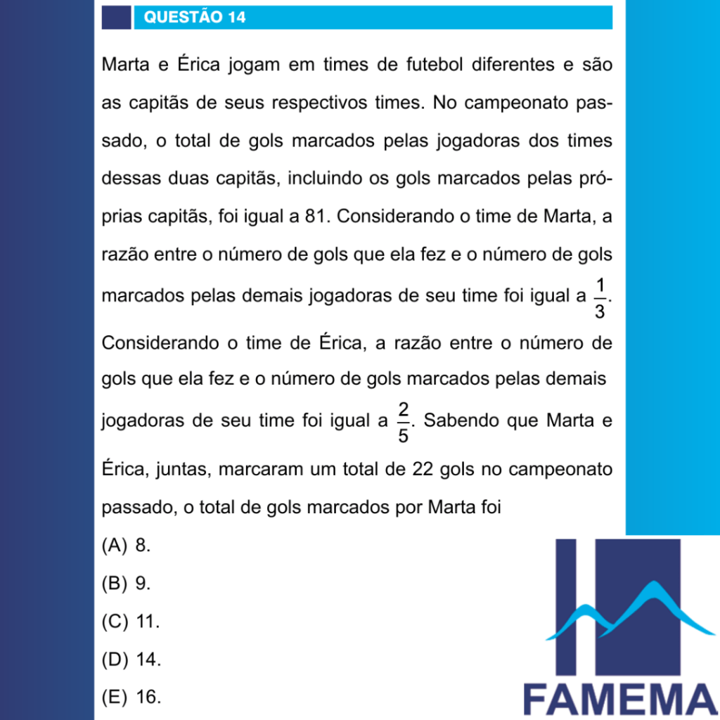Marta e Érica jogam em times de futebol diferentes e são as capitãs de seus respectivos times. No campeonato passado, o total de gols marcados pelas jogadoras dos times dessas duas capitãs, incluindo os gols marcados pelas próprias capitãs, foi igual a 81. Considerando o time de Marta, a razão entre o número de gols que ela fez e o número de gols marcados pelas demais jogadoras de seu time foi igual a 1/3. Considerando o time de Érica, a razão entre o número de gols que ela fez e o número de gols marcados pelas demais jogadoras de seu time foi igual a 2/5. Sabendo que Marta e Érica, juntas, marcaram um total de 22 gols no campeonato passado, o total de gols marcados por Marta foi