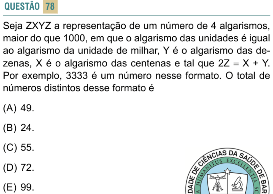 Seja ZXYZ a representação de um número de 4 algarismos, maior do que 1000, em que o algarismo das unidades é igual ao algarismo da unidade de milhar, Y é o algarismo das dezenas, X é o algarismo das centenas e tal que 2Z = X + Y.