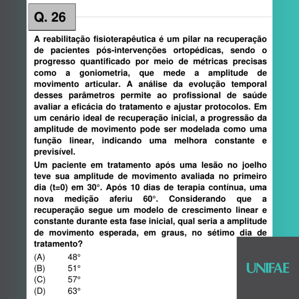 A reabilitação fisioterapêutica é um pilar na recuperação de pacientes pós-intervenções ortopédicas, sendo o progresso quantificado por meio de métricas precisas como a goniometria, que mede a amplitude de movimento articular. A análise da evolução temporal desses parâmetros permite ao profissional de saúde avaliar a eficácia do tratamento e ajustar protocolos. Em um cenário ideal de recuperação inicial, a progressão da amplitude de movimento pode ser modelada como uma função linear, indicando uma melhora constante e previsível.
