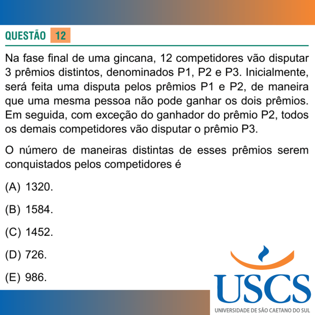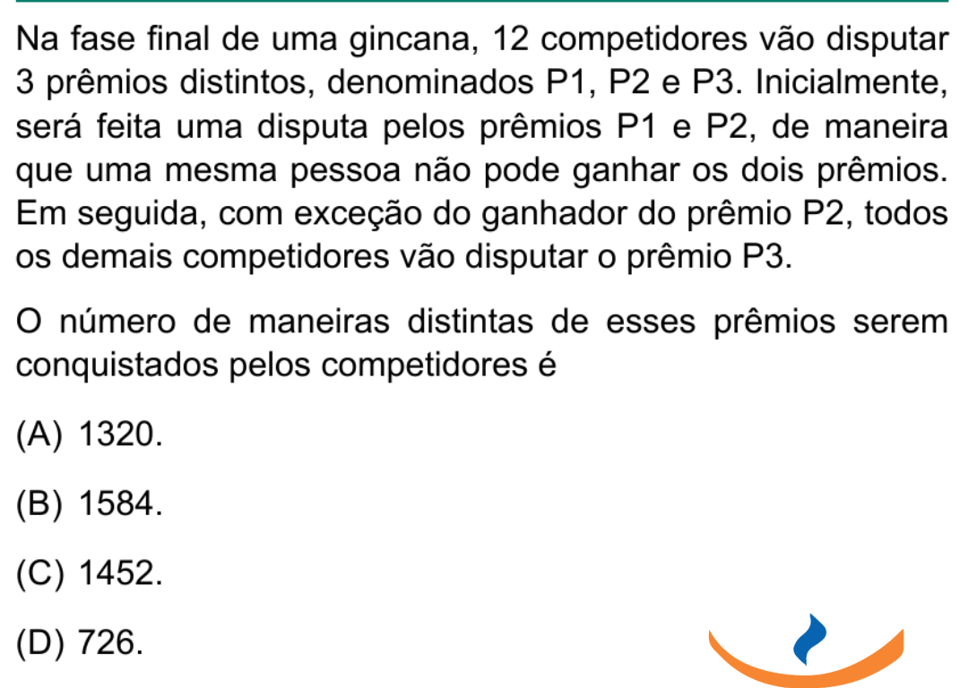 Na fase final de uma gincana, 12 competidores vão disputar 3 prêmios distintos, denominados P1, P2 e P3. Inicialmente, será feita uma disputa pelos prêmios P1 e P2, de maneira que uma mesma pessoa não pode ganhar os dois prêmios. Em seguida, com exceção do ganhador do prêmio P2, todos os demais competidores vão disputar o prêmio P3.