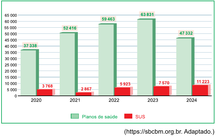 Analise o gráfico que mostra o número de cirurgias bariátricas realizadas por meio de planos de saúde e pelo Sistema Único de Saúde (SUS) no período de 2020 a 2024.