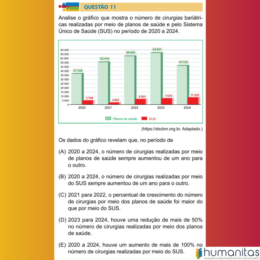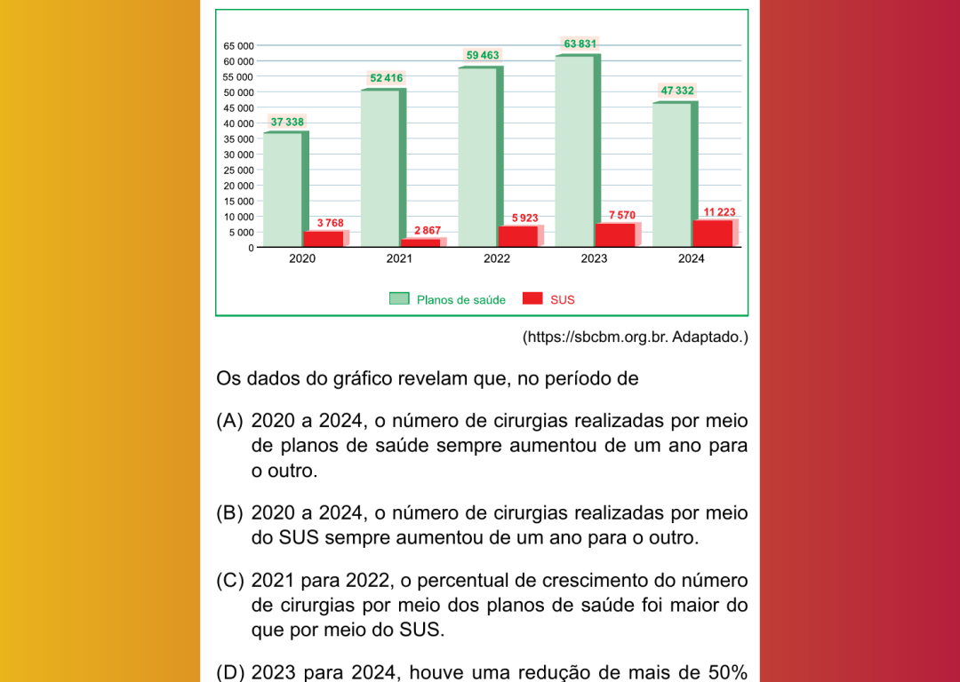 (E) 2020 a 2024, houve um aumento de mais de 100% no número de cirurgias realizadas por meio do SUS.