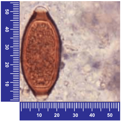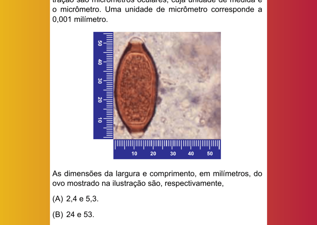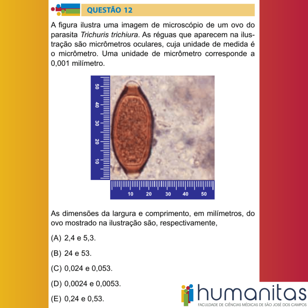 A figura ilustra uma imagem de microscópio de um ovo do parasita Trichuris trichiura. As réguas que aparecem na ilustração são micrômetros oculares, cuja unidade de medida é o micrômetro. Uma unidade de micrômetro corresponde a 0,001 milímetro.