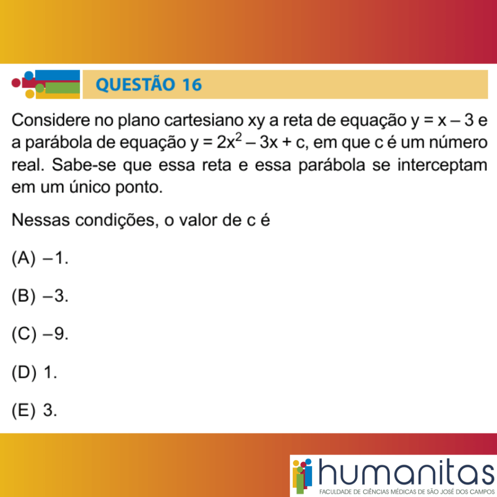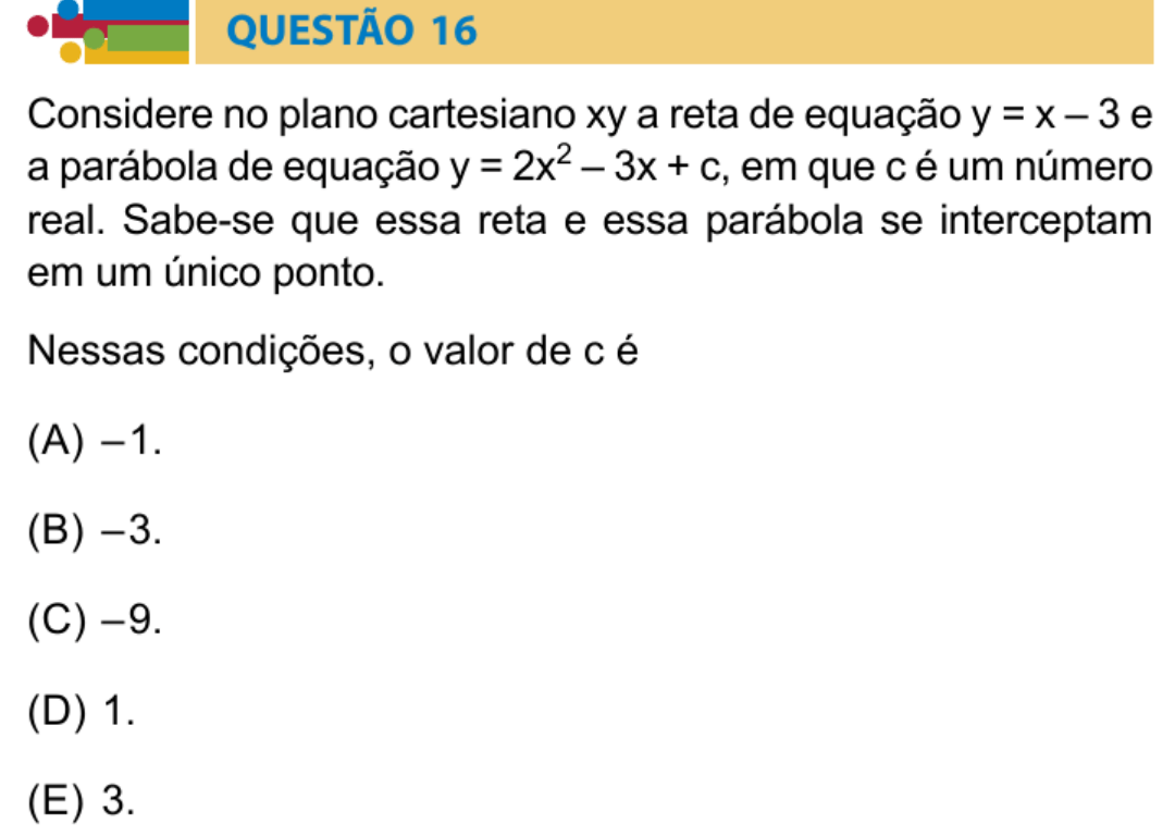 Considere no plano cartesiano xy a reta de equação y = x – 3 e a parábola de equação y = 2x² – 3x + c, em que c é um número real. Sabe-se que essa reta e essa parábola se interceptam em um único ponto.