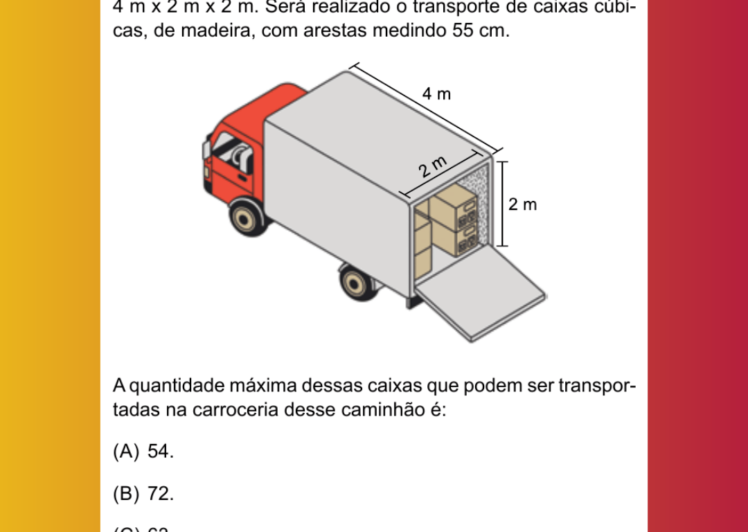 4 m x 2 m x 2 m. Será realizado o transporte de caixas cúbicas, de madeira, com arestas medindo 55 cm.