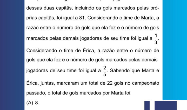 QUESTÃO 11A tabela apresenta três frações e as doze primeiras casas decimais correspondentes às representações decimais dessas frações: 0,252525252525… 0,857142857142… 0,123123123123… Para as três frações apresentadas, a primeira casa decimal é, respectivamente, 2, 8 e 1; a segunda casa decimal é, respectivamente, 5, 5 e 2; e considere que a centésima casa decimal seja representada, respectivamente, pelas letras x, y e z. O valor de x + y + z é igual a(A) 10.(B) 8.(C) 11.(D) 7.(E) 12. Para resolver essa questão, eu preciso obter o algarismo que ocupa a centésima casa decimal de cada uma dessas três dízimas periódicas, … Continuar lendo FAMEMA 2025 – Dízima Periódica