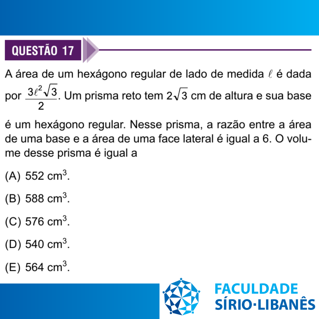 Volume do Prisma Hexagonal Sírio-Libanês Medicina 2026 Questão 17 Resolvida